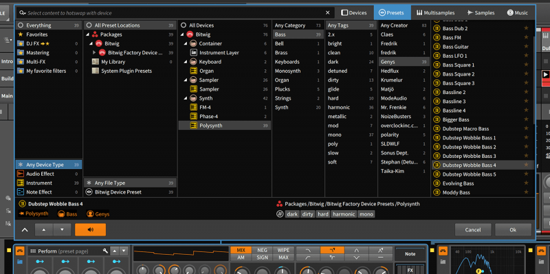 Всплывающий браузер Bitwig Studio позволяет быстро и интуитивно выбирать и прослушивать пресеты встроенных девайсов, пресетов, VST плагинов и сэмплов. Благодаря встроенным функциям поиска, фильтрации и отбора, процесс навигации станет по-настоящему простым и быстрым.